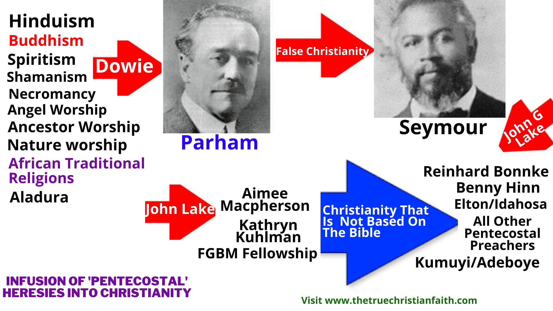 In 1898 Parham came under the influence of the aforementioned Frank Sandford ( a thorough-bred occultist), and in 1900 Parham traveled to Chicago to study the ministry of John Dowie (another fake prophet) and to examine Zion City.